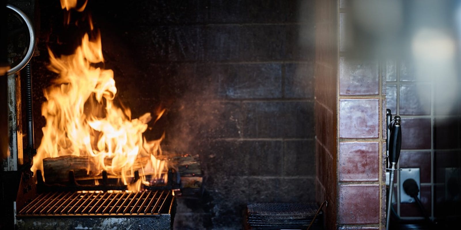 店内中央に設置された薪グリルで